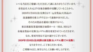 【東京】パチンコ屋の大景品交換玉数が金地金価格高騰で変更、TUCは大景品6000円で買い取り